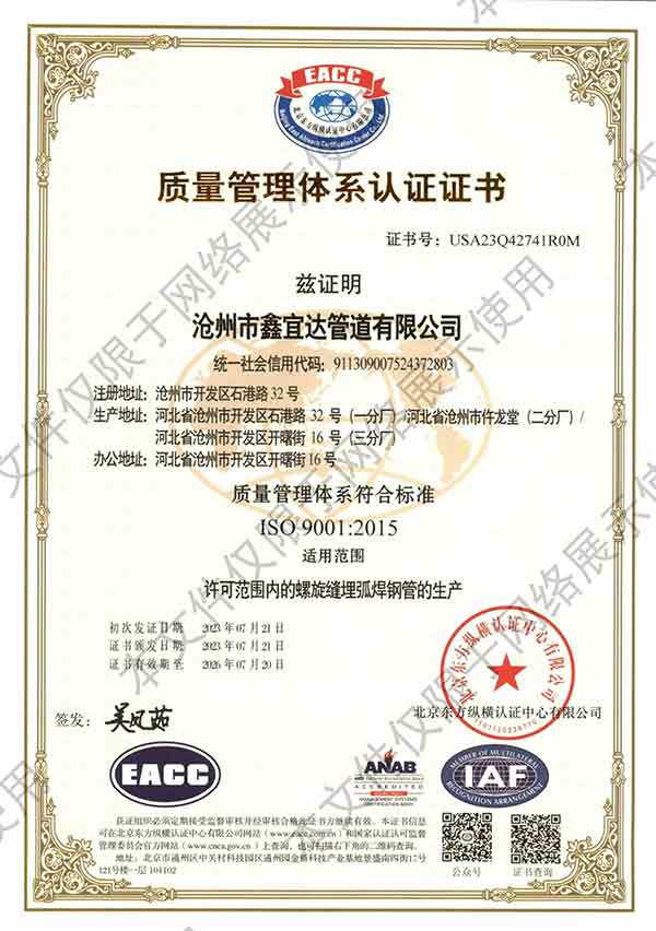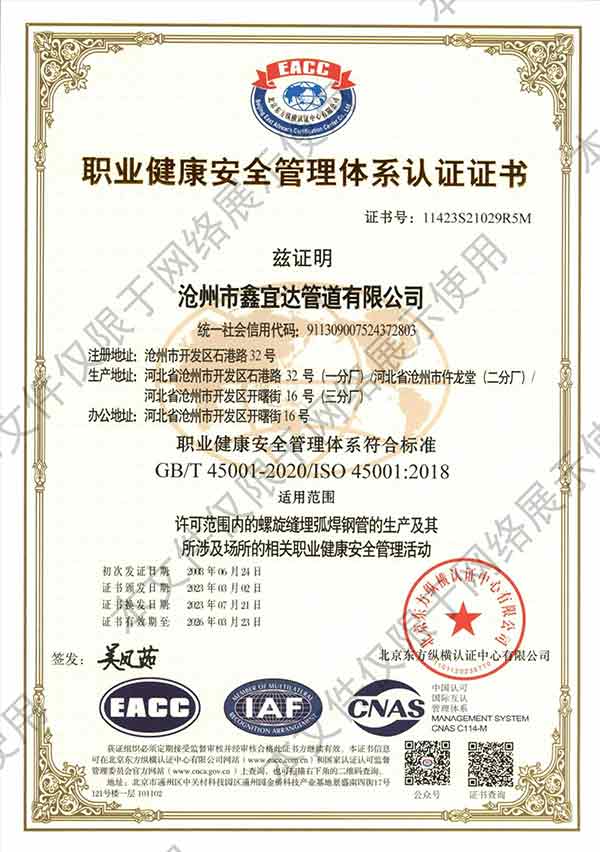 滄州市鑫宜達管道有限公司成立于2003年7月,坐落于滄州經(jīng)濟開發(fā)區(qū),占地面積40萬平方米,注冊資金1.81億元,是集螺旋鋼管生產(chǎn)、防腐加工以及無縫鋼管、卷板、帶鋼等品類鋼材經(jīng)營銷售于一體的工貿型企業(yè)。公司現(xiàn)有員工400多人,其中,中高級技術職稱的人員達120余名。 滄州市鑫宜達管道有限公司擁有9條螺旋鋼管生產(chǎn)線和3PE防腐生產(chǎn)線,可生產(chǎn)直徑219--3640mm,壁厚5.5--28mm,最高鋼級X100的各種規(guī)格防腐螺旋鋼管...